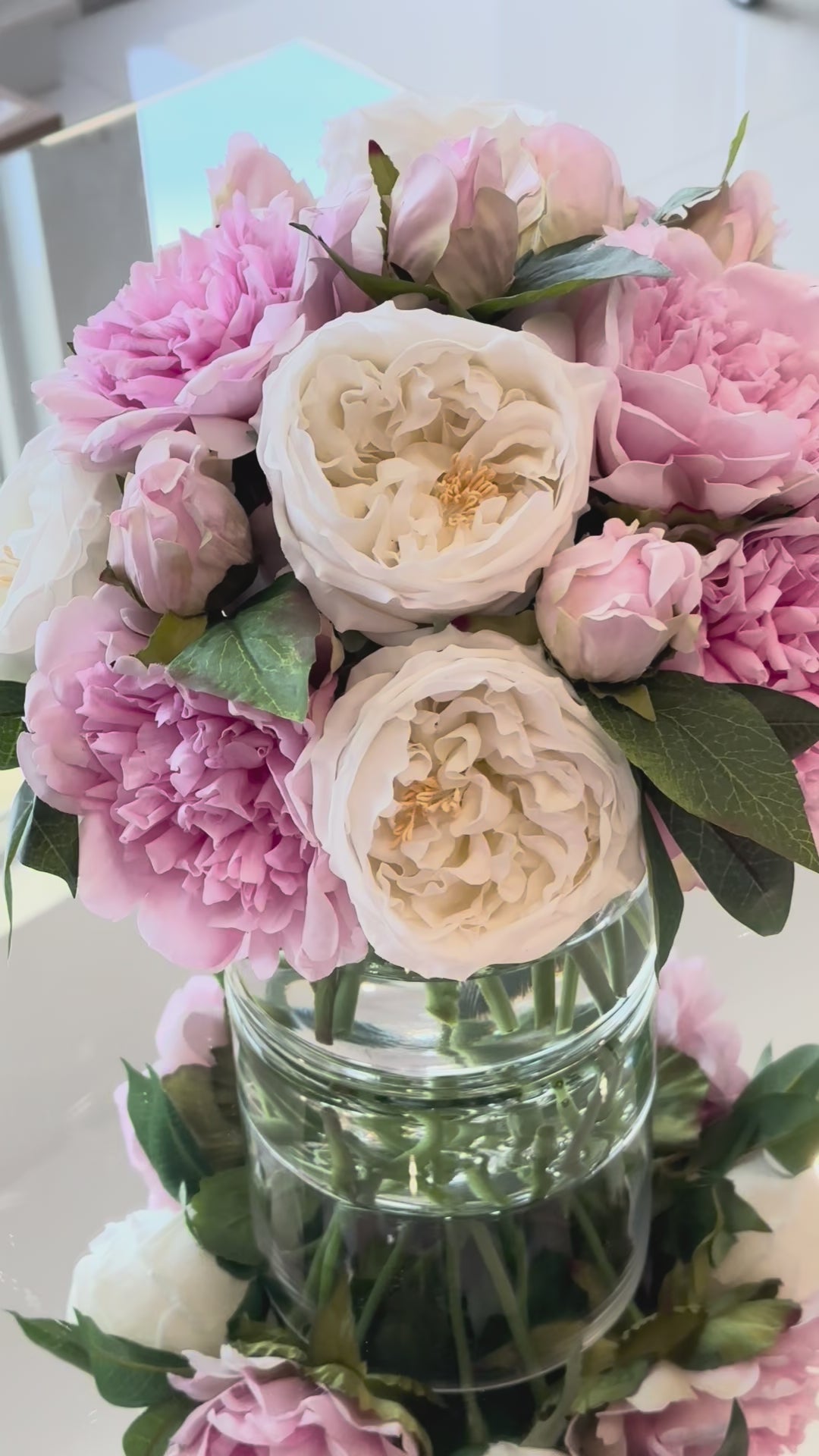 Real touch pink peony and white rose arrangement with greenery accents set in faux water