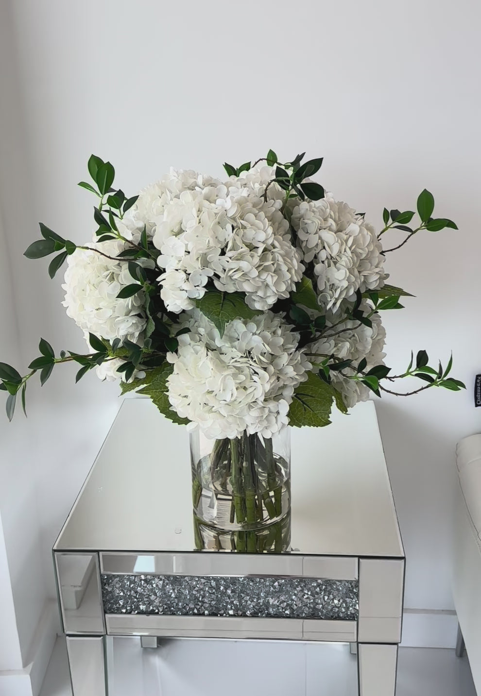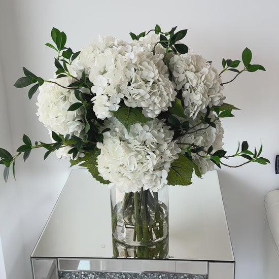 Bring timeless elegance into your home with this luxurious large white hydrangea centerpiece, handcrafted with real touch, high-quality artificial blooms that look and feel incredibly realistic. Nestled in a clear glass vase, the full hydrangea blossoms are complemented with lush greenery, creating a fresh and sophisticated statement piece.